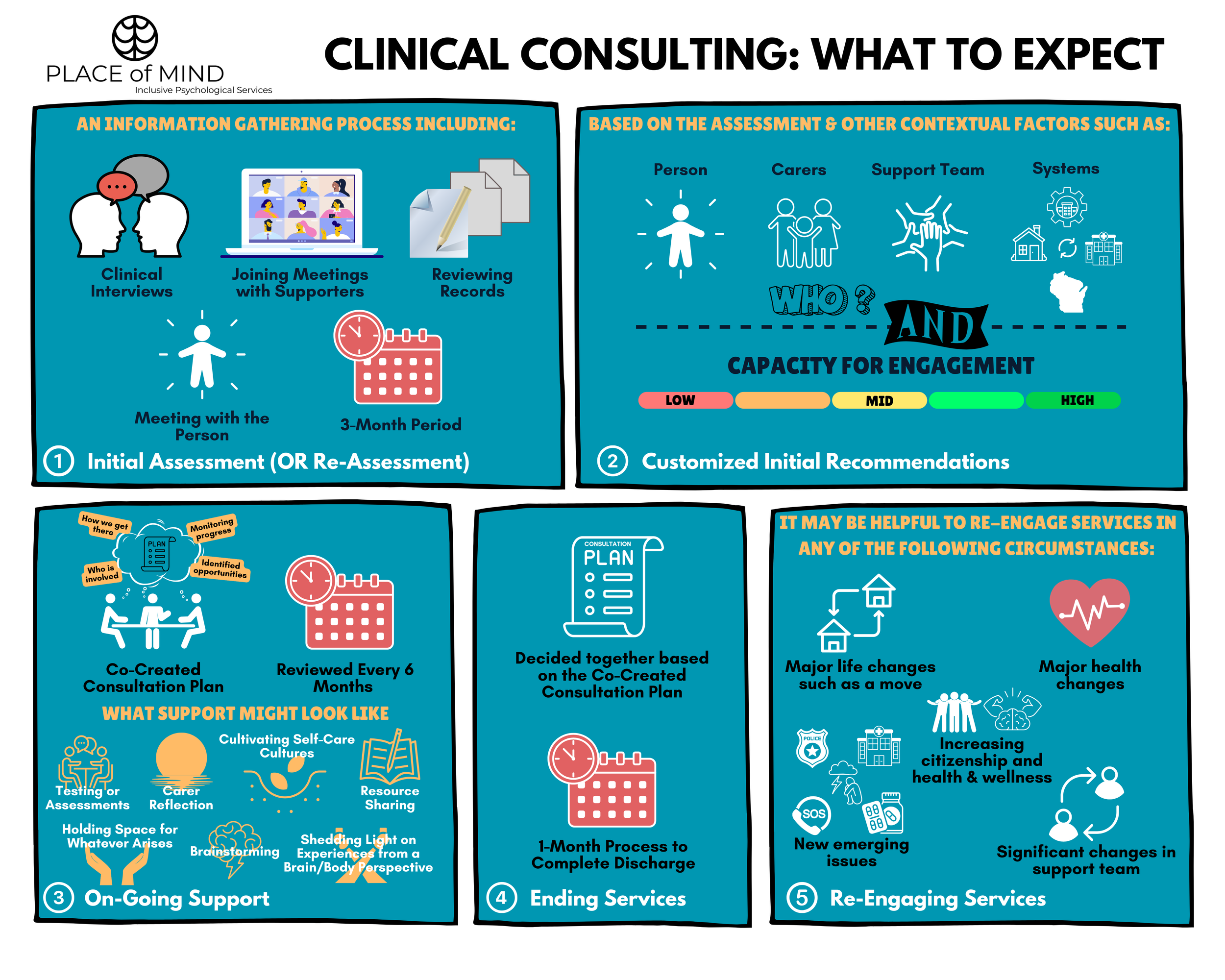 Supportive consultation services can be helpful to engage and follow-through with feedback and recommendations from an assessment process. Services can also be provided independent of an assessment. All services are individualized and can include person centered support planning, connecting with providers and community resources, joining with schools, advocacy and empowerment, modifying environments, and training providers and support team members.